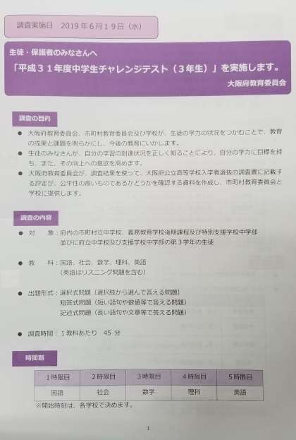 6月19日(水)に平成31年度中学生チャレンジテストが実施されます。