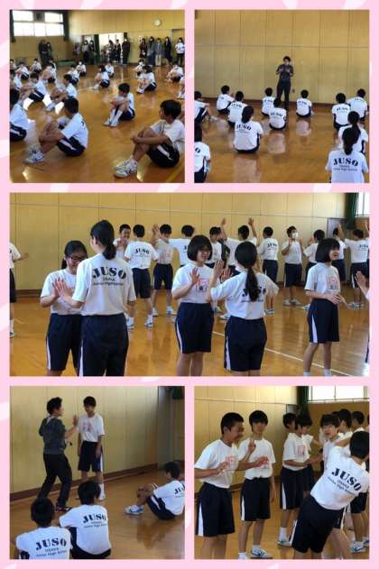 3組は体育。格技室で男女合同で行いました。体のバランスをとる取り組みやトレーニングなど、みんなでリラックスしながら楽しく体を動かしていました。