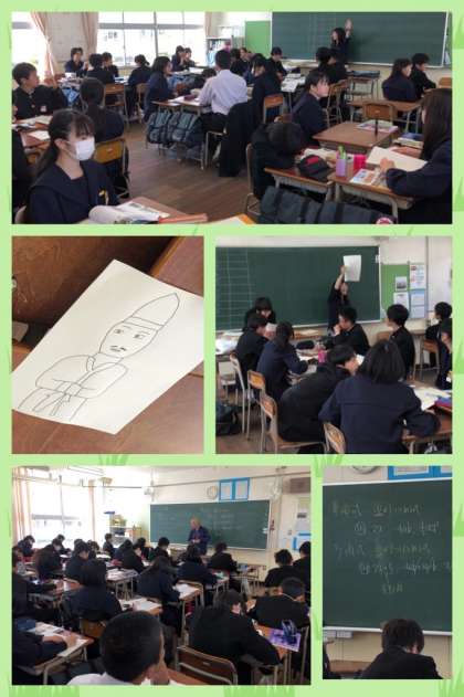 1組は社会。グループで歴史上の人物についての問題を作成しました。それぞれの班で話し合いながら、イラストを交えて考え、他の班の人に出題していました。