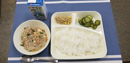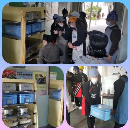 給食配膳員の皆さまをはじめ、教職員総動員で給食の準備をします。