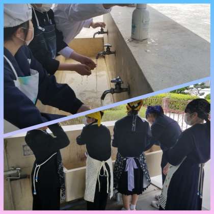 1年生の給食当番がエプロン、マスク、三角きんをつけ、一階階段下までワゴンで運ばれてある食缶等を取りに来ます。しっかり手を洗い、アルコールで殺菌してから教室まで運びます。