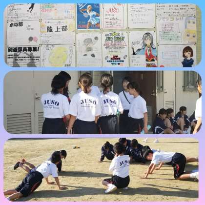 本校では運動部が9つ、文化部が6つあり、活動もたいへん活発です。広い運動場に野球部、ハンドボール部、陸上部、テニス部、サッカー部等が熱心に練習しています。