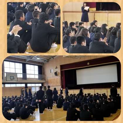 この集会では、4月生まれの生徒がBGM『愛をこめて花束を♪』の流れる中で紹介されていました。皆さん、おめでとうございます。