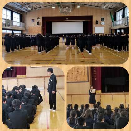 水曜日は2年生の学年集会です。8時20頃にはほぼ全員が揃い隊列が組まれていました。集会を進行する女子、声を張り上げ全体のあいさつの号令かける男子と、それぞれが役割を果たします。