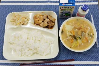 今日のメニューは、焼き鳥ともやしのゆずの香あえ、具材豊富な味噌汁でした。