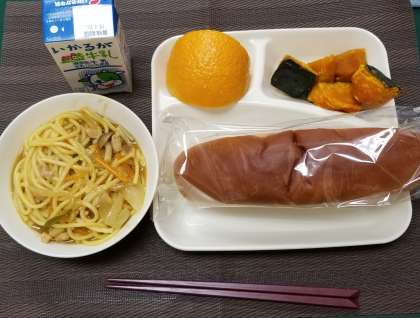 カレースープスパゲティに焼かぼちゃと甘夏ミカンがついていました。