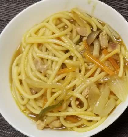 カレースープ? ほとんどスープがありません。麺類なので時間とともに汁を吸ってしまうので仕方ないですが、少し残念でした。でもカレーの良い香りが食欲をそそります。