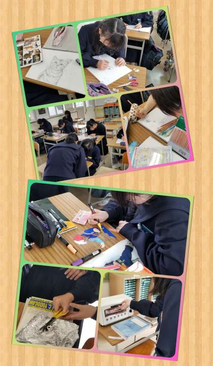 動物写真集Catsから猫の絵を丁寧に鉛筆で描きます。また、漫画調の絵に色をつけている生徒もいます。そんな中、後方からプラスチックの焼けた匂いが漂ってきました。オーブントースターで何かを焼いています。調理実習か?