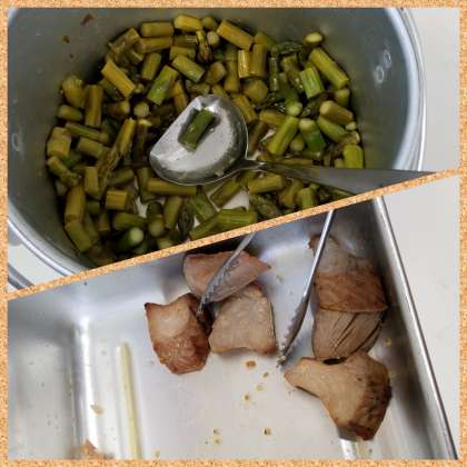 5月8日の給食は、かつおのガーリック焼とグリーンアスパラガスのサラダに鶏肉とジャガイモスープでした。