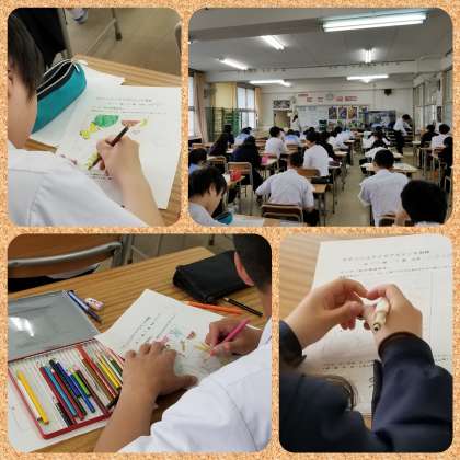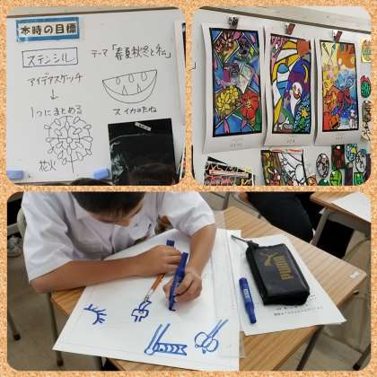 2年生の美術授業ではステンシャルによる作品作りを行っていました。