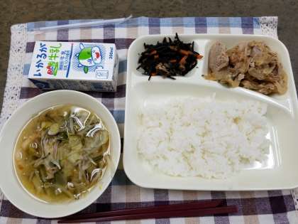今日は、豚肉のごまだれ焼とひじきの炒め煮に五目汁でした。