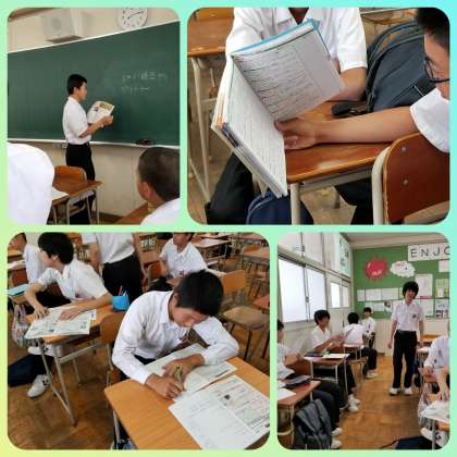 三年生教室では、早めに登校し友人と出題範囲内での問題の出し合いや黒板を使って言葉の確認など、意識の高さが伺えます。