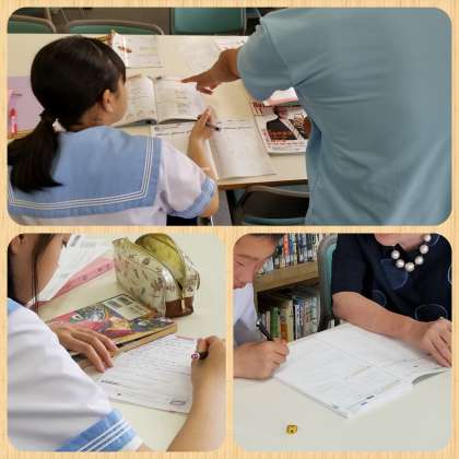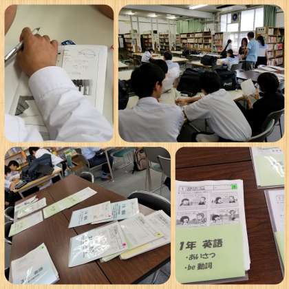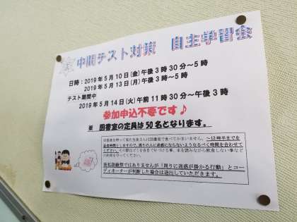 放課後、図書室では明日のテストに向けて、『元気アップ 自主学習会』に生徒が集まっていました。図書室の大きな机上には、学年単位で単元ごとに自主学習できるようにと、A4サイズの問題が印刷され置かれていました。
