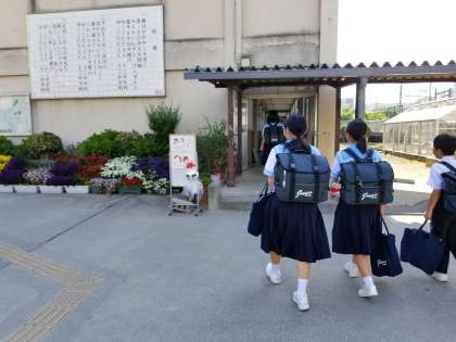 快晴の朝、登校する生徒に朝日が差し込んでいます。
