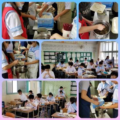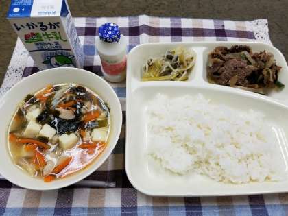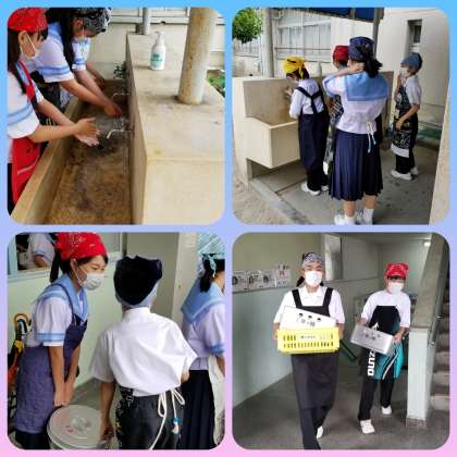 教室では、給食配膳当番がそれぞれ役割を果たします。動きを見ているとみんな学校生活、給食準備等に慣れていました。