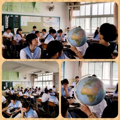 先生が地球儀を手に持ちヒントを出します。地球の地軸には傾きがあり、そのまま太陽の周囲を回ります。その時の太陽の光の当たり方はどうなっていますか?
