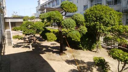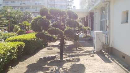 昨年、台風21号の影響で斜めに倒れていた松の木2本を管理作業員さんに直していただきました。