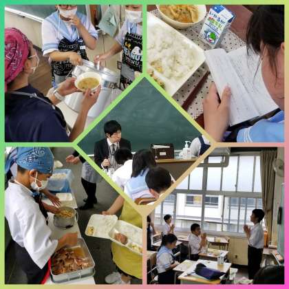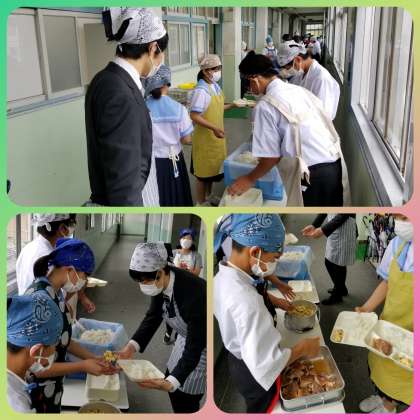1年生の教室、給食の準備です。実習生もエプロン、三角きん、マスクを付け準備に当たります。授業以外でも生徒との触れ合いの時間があります。ひと昔前までは、大阪市中学校に給食はありませんでした。実習生も小学校以来ではないでしょうか。懐かしく給食準備にかかわり、楽しい時間を過ごしています。