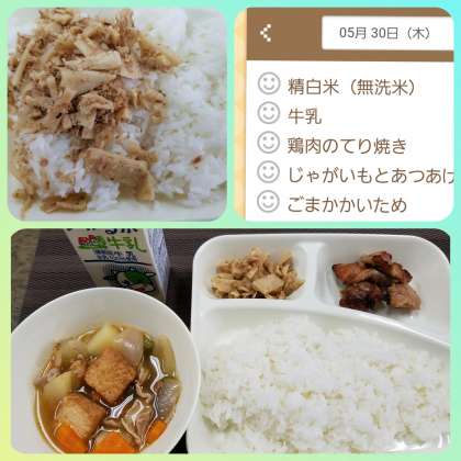 今日の2.3年生の給食は、旬の食材、筍でした。温かご飯に『ごまかかいため』を絡めていただきます。