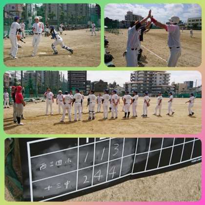 2試合目は、きょうだい校対決、西中島小学校との試合でした。初回満塁ピンチをしのぎ0点で抑えると、その後、十三は小刻みに点を重ねて最終回までリードを保ちます。