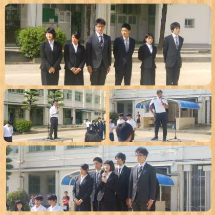集会では、生徒会による標語の表彰がありました。また、3週間の教育実習を終えた大学生によるお礼のご挨拶がありました。
