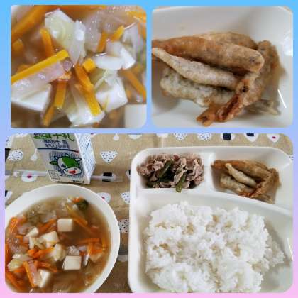 今日の給食は、野菜豊富なすまし汁に、旬の魚いわしの天ぷらです。