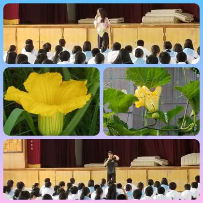 学校菜園では南瓜の花が初夏の日差しを浴びて生長しています。