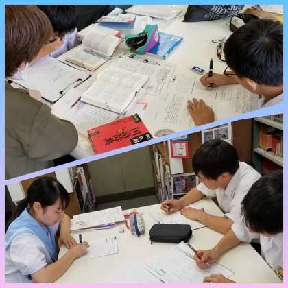 仲間と机を囲み学習に集中する生徒たち。決しておしゃべりすることなく集中して取り組んでいました。