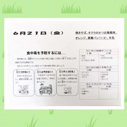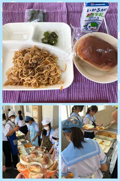 焼きそばは具だくさんで、肉や野菜以外にもイカが入っています。オクラはかすかな梅の風味がきき、あっさりと食べやすく箸がすすみます。暑くなってきて疲れが出てきそうなこの時期ですが、生徒たちはたくさんお代わりをしていました。