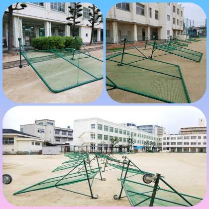 本校も暴風等対策として、運動場の防球ネットを全て横倒しにし、安全対策をとっています。