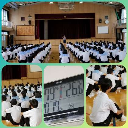 木曜日は3年生の集会です。時間に余裕を持った登校で、8時25分には集合が完了し、学年教員からの講話が始まっていました。