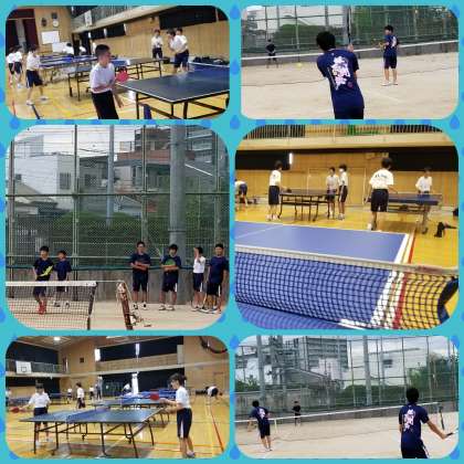 体育館では、フロアーいっぱいに張られた卓球台でにぎやかに練習を行っていました。熱中症対策で、個人のペースで給水できます。フロアーの隅には水筒が並べられていました。