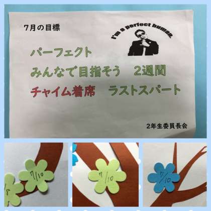 どのクラスでも効果が表れ、本日は4クラスともチャイム着席が達成できました!この調子で、目標「最後の学年集会で全クラス表彰」を達成できるようにがんばりましょう!