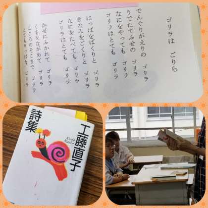 ボランティアのお一人は、工藤直子さんの詩集から、あれもこれも紹介したいとお話されていました。持参された本にはたくさんの付箋が貼られ、そのなかから『ゴリラはごりら』を推薦してくださいました。