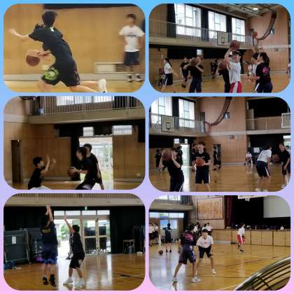 体育館では男女バスケットボール部がシュート練習や1対1の攻防を繰り返していました。バスケットボール部は先日『夏の選手権大会』1回戦に臨み、男女とも勝利しました。