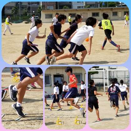 陸上部が声を出しながら、ラダーやミニハードルの基礎トレーニングに励んでいました。給水後は、カーブを利用したリレーのバトンパスを繰り返し練習していました。