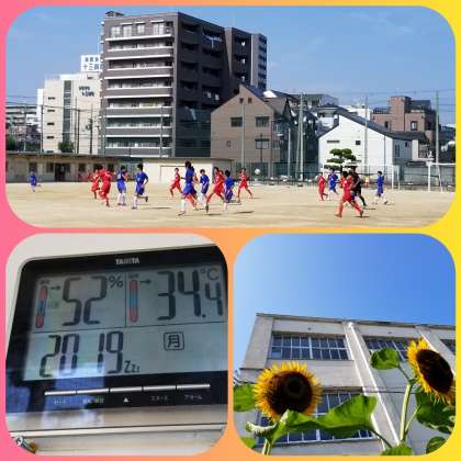 廊下の気温計は34度。 運動場は、照りつける日差しで気温がかなり高くなっています。