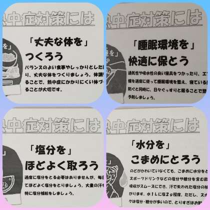 廊下掲示板には、熱中症対策のポスターが掲示されています。
