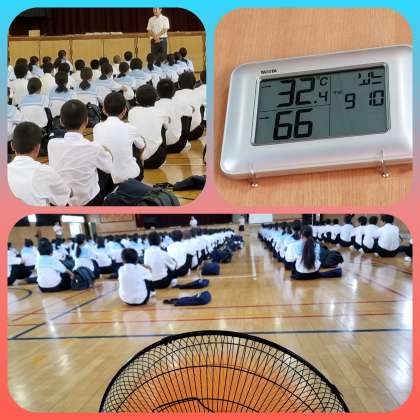 体育館の温度計は32度を指していました。今までが異常な暑さだったためか、多くの扇風機が稼働していることもあり、比較的暑さが落ち着いているように感じました。