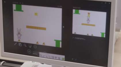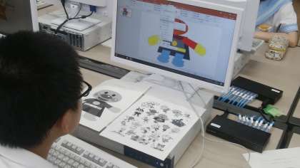 パワーポイントで図形を使ってデザインし、ストーリーを作る実習をしています。