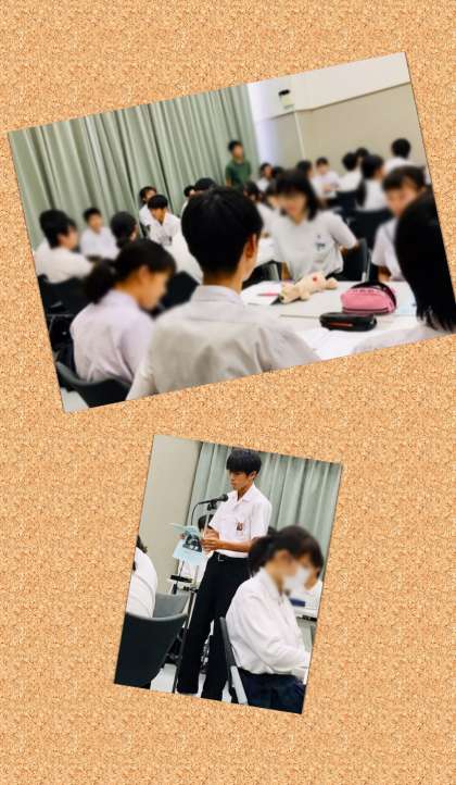 9月3日(火)英真高校において、中学校教育研究会 特別活動領域で、『第4ブロック生徒会交流会』を開催しました。写真は他校生徒会が集う場において、発表する十三中学校生徒会の様子です。