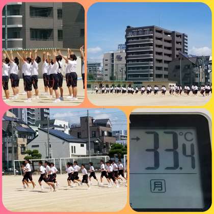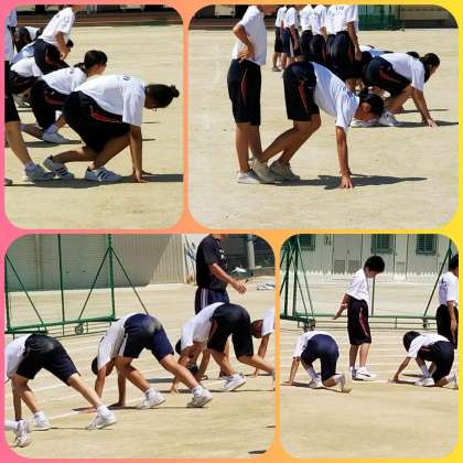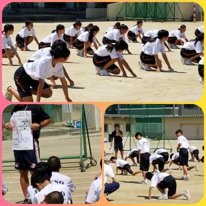 1年生が陸上競技、短距離走のクラウチングスタートについて学習していました。知識・理解について、表示資料を見て学び、友人と協同学習を行います。