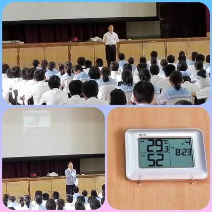 木曜日は3年生の学年集会。後方の壁に掲げてある温度計も今朝は30度を下回りました。