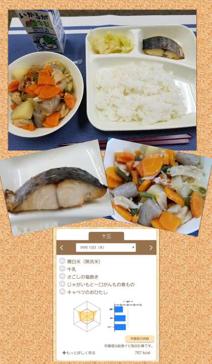 今日は若魚『さごし』を美味しくいただきました。また、煮物は野菜が半端ない量です。じゃがいも、にんじん、たまねぎ、さんどまめなど、野菜が大きくカットされていて大満足です。