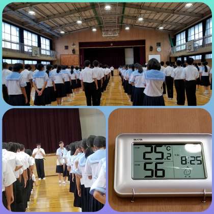 雨の登校でしたが、集会の時間に間に合わなかった生徒一人。開始時間には整然と学年集会が開始されていました。