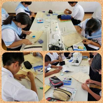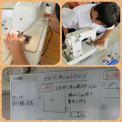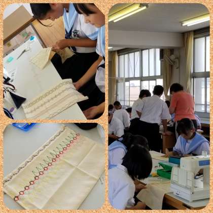 1年3組では、家庭科授業で『スウェーデン刺繍』の仕上げを行っていました。