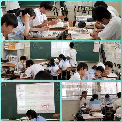 敗戦処理、戦後改革などたいへん複雑で、専門用語も多く知識が混乱する内容ですが、3年の授業ではグループによる協働学習で、主体的に学習に取り組む様子が見られます。