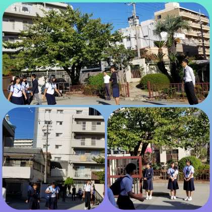 快晴の朝、日影はひんやりしています。朝の登校に立つ教員も日影を避け、日向へと移動して生徒に挨拶をしていました。