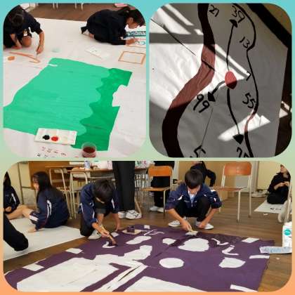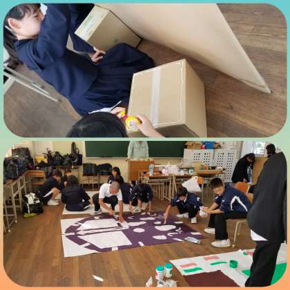 2年生の教室。床に模造紙を広げ、背景の下絵を相談したり、絵の具で舞台背景画に色を付けたりと、劇の演出に欠かせない背景画作成に取り組んでいます。一方では複数の段ボール箱をボンドで接着させ、背景画の支えを作っている生徒もいました。