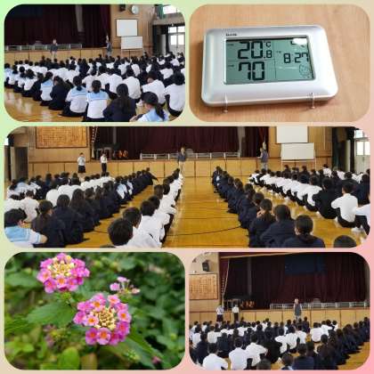 教員の講話では、今朝の雨から台風被災地の状況を想像し、心配する言葉がありました。また、自身の出勤時における失敗談や北野高校出身でリチウムイオン電池の開発に貢献しノーベル化学賞を受賞された吉野彰さんなど、時事的な話題を引用し、人の心と関連付けてお話されていました。